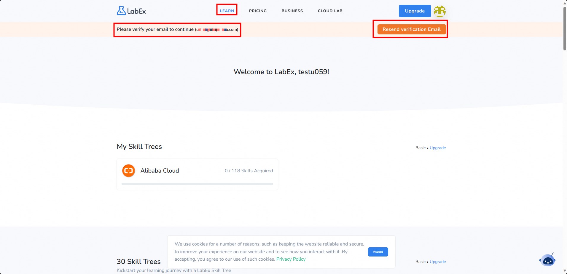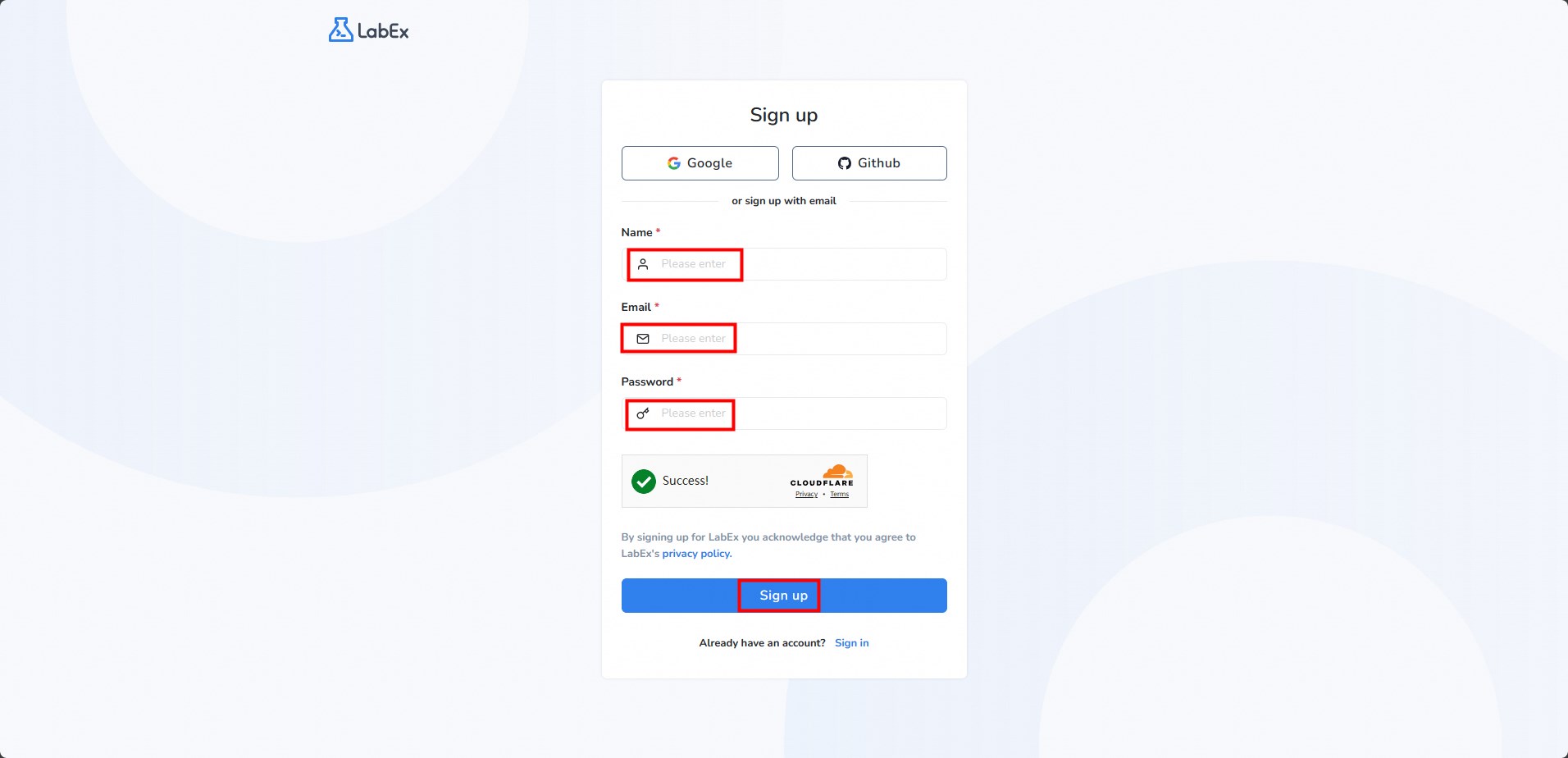 Enter the email address you need to register, set the labex account password and click Sign up.